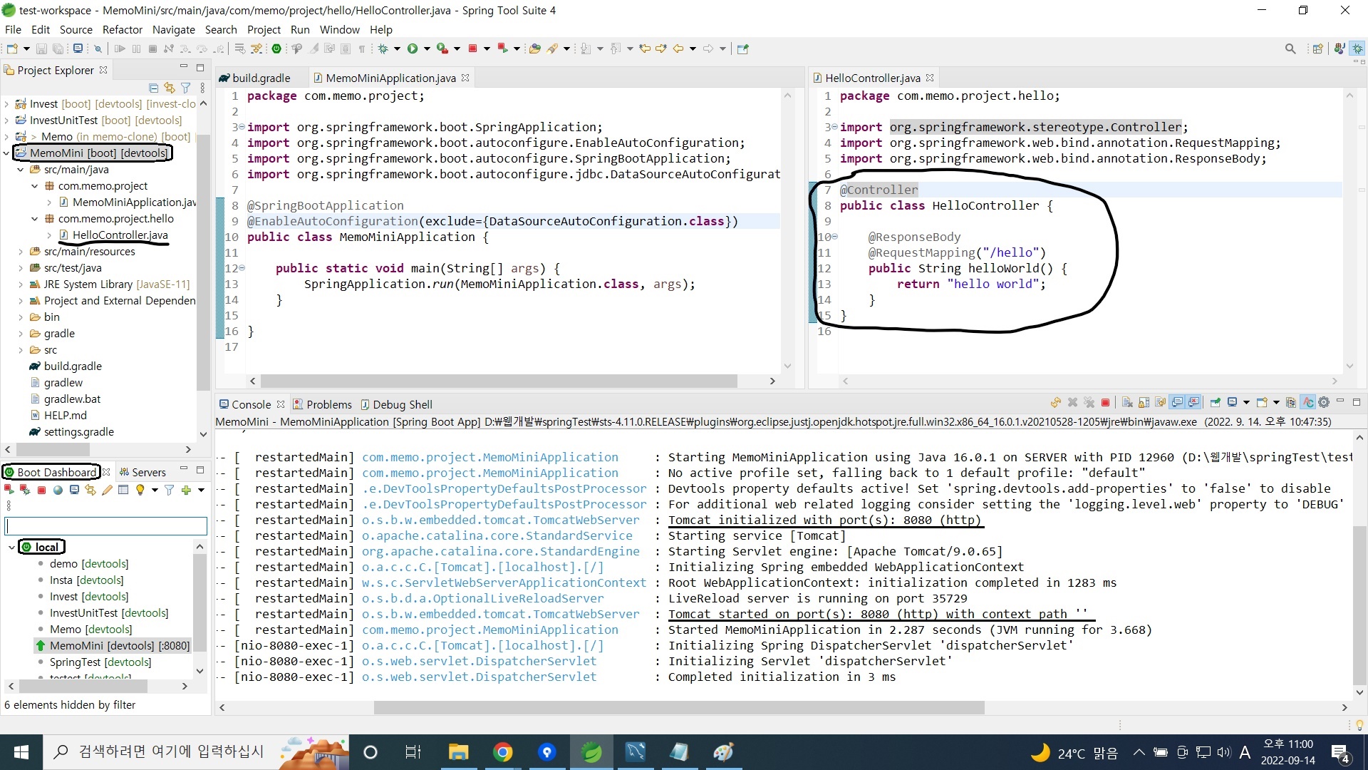 DB설정 에러를 잡기 위해 MemoMiniApplication.java에서 클래스명 위에 아래코드(어노테이션) 추가