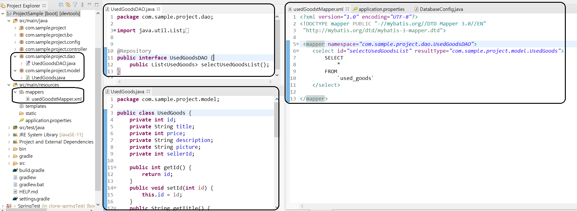 mysql로 날릴 쿼리와 , 데이터를 담을 클래스 , 데이터를 전달해주는 DAO