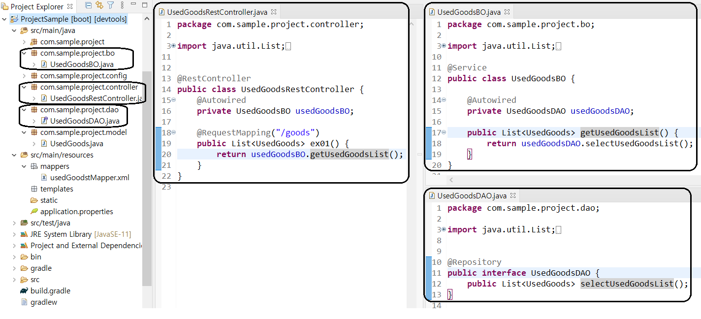 브라우저의 요청을 받고 Controller 데이터를 전달하는 , 비지니스 로직을 구성하는 BO
