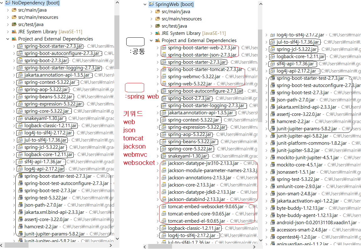 Spring Web을 추가한것은 spring-boot-starter-web 이고 NoDependency는 spring-boot-starter 이다