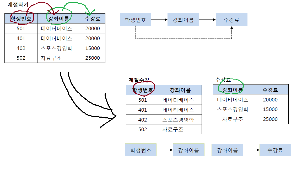 강의 코드가 "AC3"인 김현수의 전화번호를 수정할 경우, 3번째 데이터만 수정될 수있다. 그러면 3, 4번째는 같은 사용자임에도 불구하고 전화번호가 달라짐.