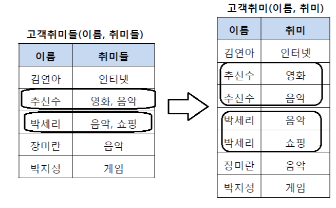 테이블의 칼럼이 원자 값(Atomic Value, 하나의 값)을 갖도록 테이블을 분해하는 것