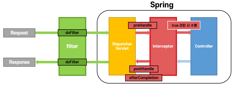 필터(Filter)와 인터셉터(Interceptor)는 컨트롤러가 수행되기 전/후 처리를 위한 개념이다.