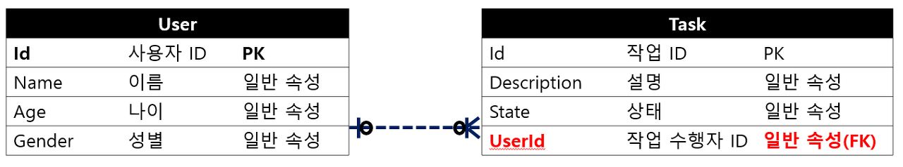 부모테이블[A 테이블]의 PK가 외래키로써, 자식테이블[B 테이블]의 PK가 아닌 일반 속성이 되는 경우