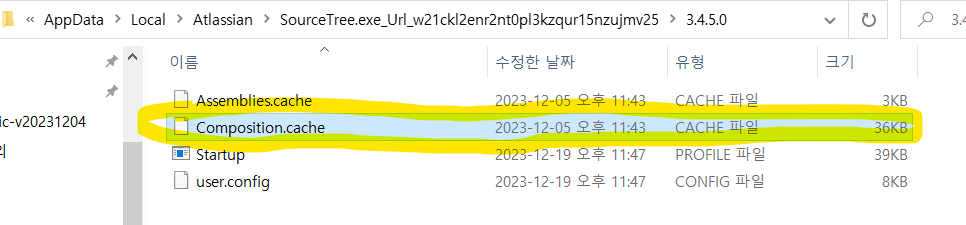 ( 캐시 파일을 삭제하고 소스트리를 재실행하면 Composition.cache 파일이 새로 생긴다. )