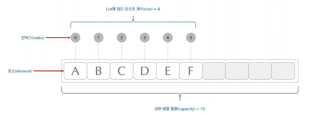 용량(capacity)과 크기(size)에 대한 용어 차이가 모호할 수 있는데, capacity는 리스트의 공간 용량라고 보면되고, size는 현재 사용 중인 공간의 크기라 이해하면 된다.