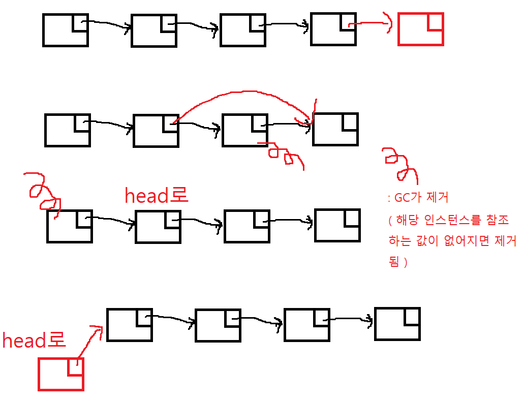LinkedList는 노드(객체) 끼리의 주소 포인터를 서로 가리키며 링크(참조)함으로써 이어지는 구조이다.