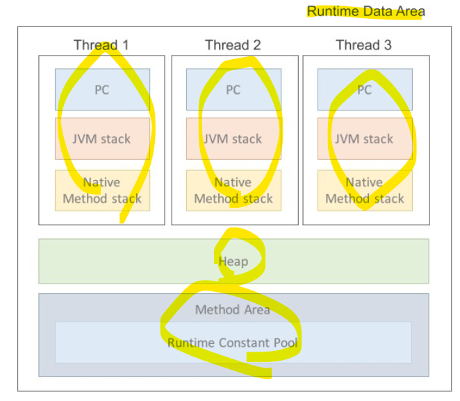 | 각 쓰레드 별로 생성되는 영역 | 나머지 Stack Area, PC Register, Native Method Stack |