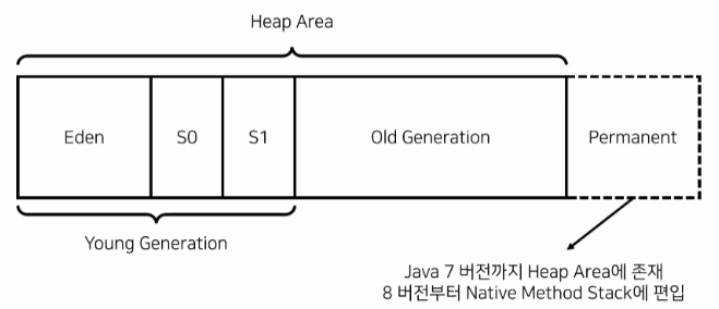 Java 7 까지는 힙 영역에 존재했지만 Java 8 버전 이후에는 Native Method Stack에 편입되게 된다.