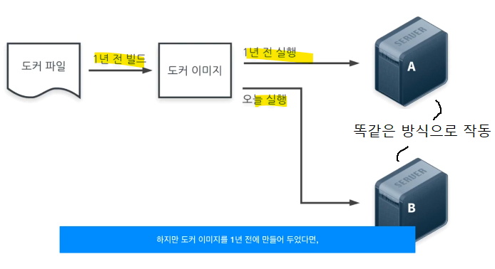 1년전에 만들어둔 도커이미지를 오늘 실행해도 1년전과 똑같은 방식으로 작동함