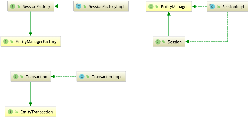 Hibernate에서는 각각 SessionFactory, Session, Transaction으로 상속받고 각각 Impl로 구현하고 있음을 확인할 수 있다.