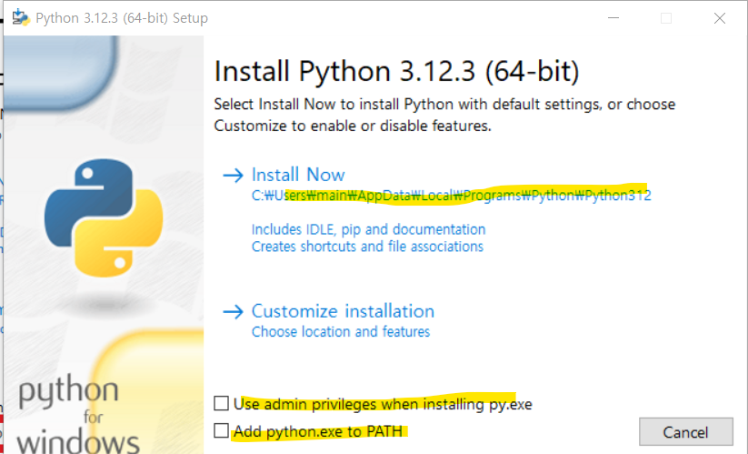 이 옵션을 사용하면 설치 중에 시스템 PATH 환경 변수에 Python을 추가할 수 있습니다. 이걸 선택하셔야 Python 실행파일의 전체 경로를 지정하지 않아도 모든 디렉터리의 cmd에서 Python을 실행할 수 있습니다.
