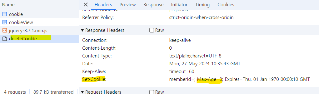 ( 근데 request쪽에 Cookie: memberId = 1 도 잡혀있음, 왜그런지는 모름 )