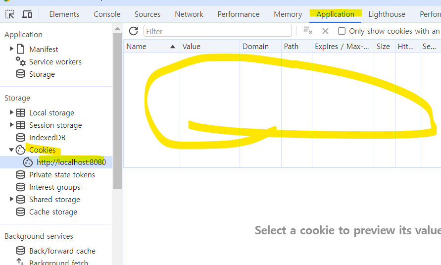 쿠키 저장소엔 , 쿠키가 없어진걸 확인할수 있음
