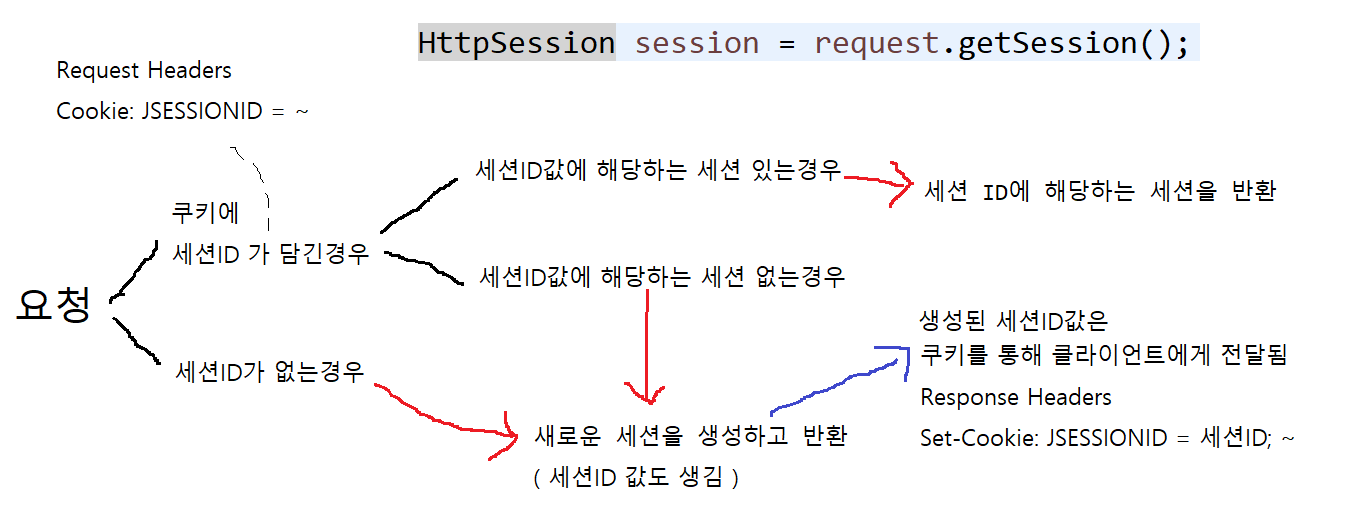 요청을 처리하는 도중 새로운 HttpSession이 생기면, 자동으로 응답헤더에 Set-Cookie : JSESSEIONID = 세션ID 가 추가되어 Cookie를 이용하게 된다.