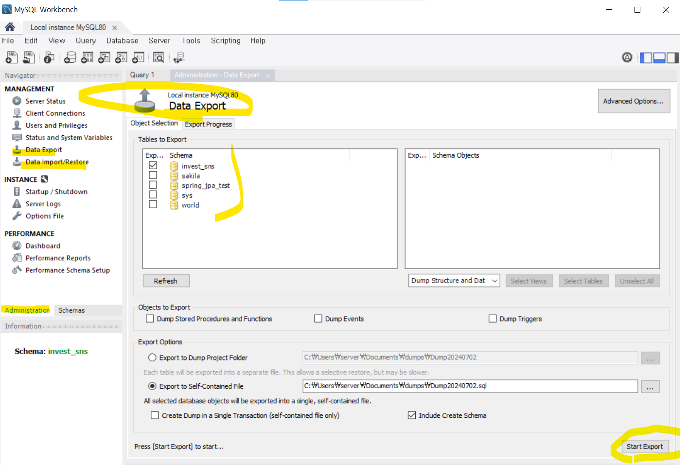 Administration - Management 에 Data Export, Data Import/Restore 있음