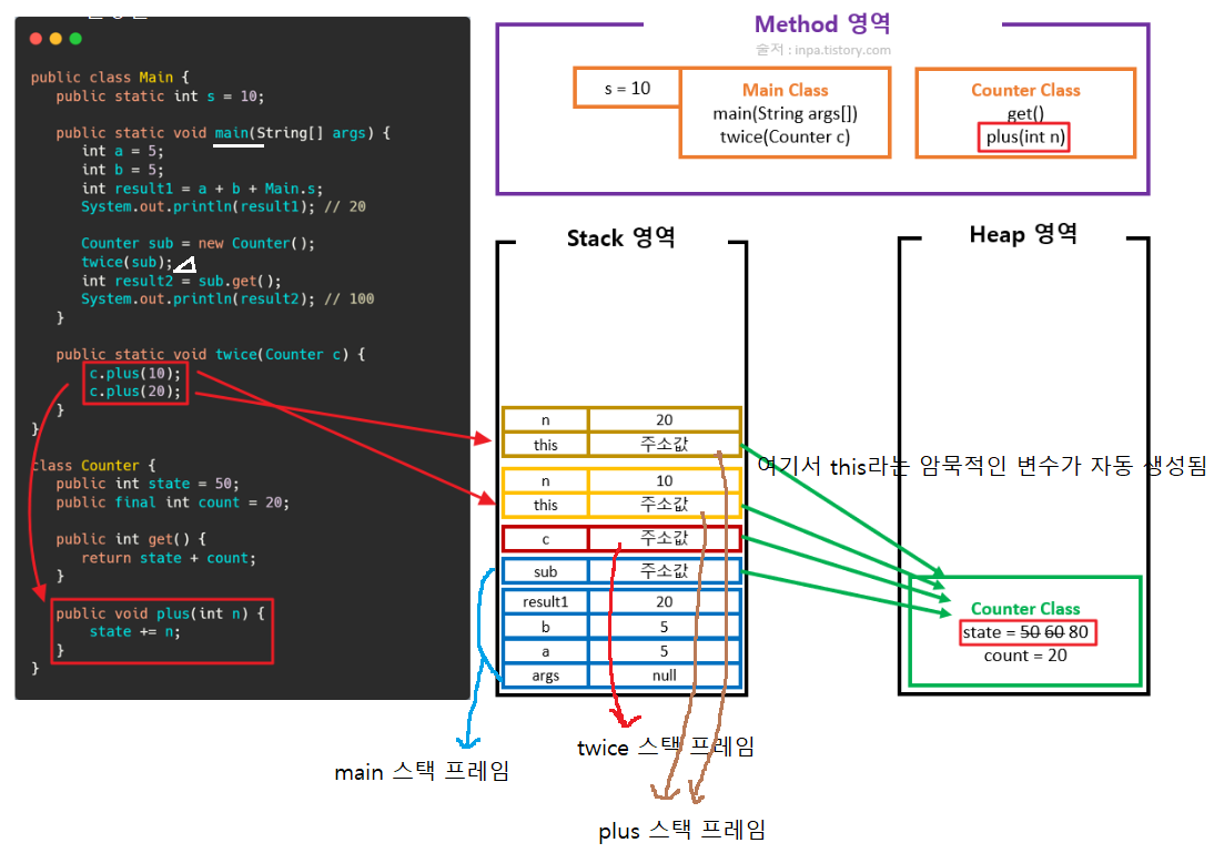 그러다 어떤 참조 변수도 Heap 영역에 있는 인스턴스를 참조하지 않게 된다면, GC(가비지 컬렉터)에 의해 메모리에서 청소된다.