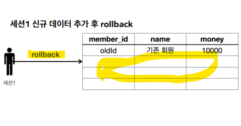 그런데 세션1이 롤백을 수행하면 신규 회원1, 신규 회원2의 데이터가 사라지게 된다