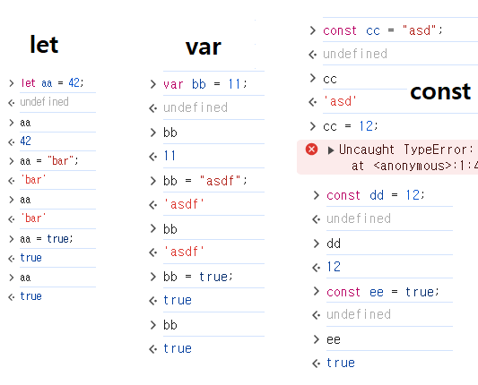 변수를 var, let으로 만들면 재할당이 가능하고 const로 만들면 값 재할당이 불가능