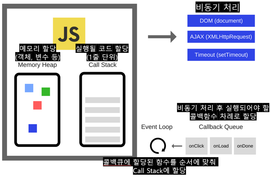 브라우저에서 제공하는 Web API들( DOM, Ajax, setTimeout, 이벤트루프 등 ) 그리고 이벤트 등과 함께 동작하면서 런타임이 이루어진다.
