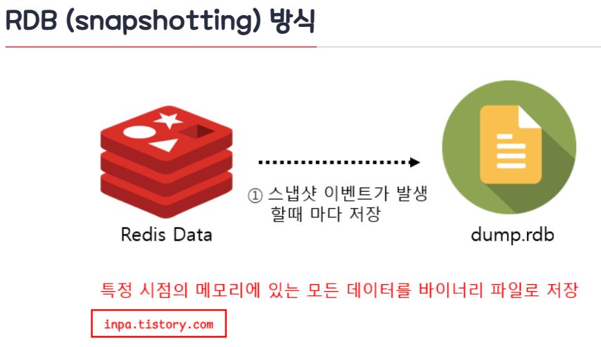 RDB방식은 특정한 간격마다 메모리에 있는 레디스 데이터 전체를 디스크에 쓰는 것이다.(백업에 용이)