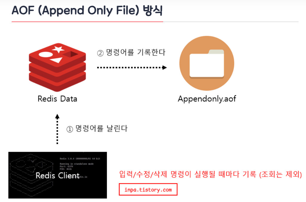 AOF방식은 redis의 모든 write/update 연산 자체를 모두 log파일에 기록하는 형태이다.