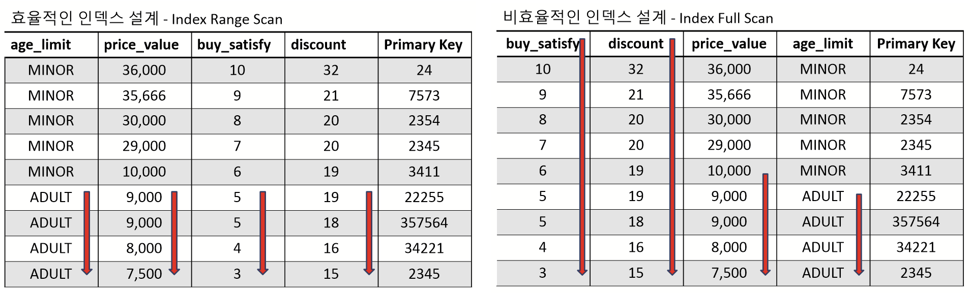 최대한 range스캔을 태워서 필요한 값의 인덱스 스캔만 하도록 하되