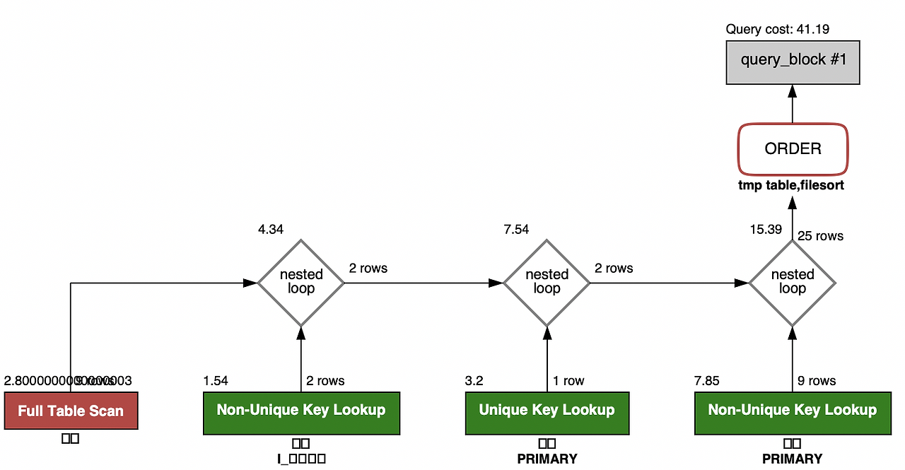어떤 테이블은 full table scan이고, 어떤 테이블은 index range / full / unique scan인지 시각화 하여 보여줍니다. 어떤 방식으로 조인되었고, 결과 row는 몇 개 이며, group by 및 order by는 어떤 식으로 수행되었는지 확인할 수 있습니다.
