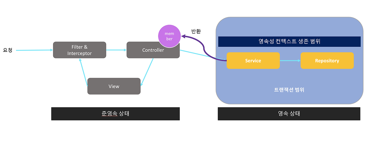 , 트랜잭션이 끝나는 순간에 PersistenceContext도 종료됨.