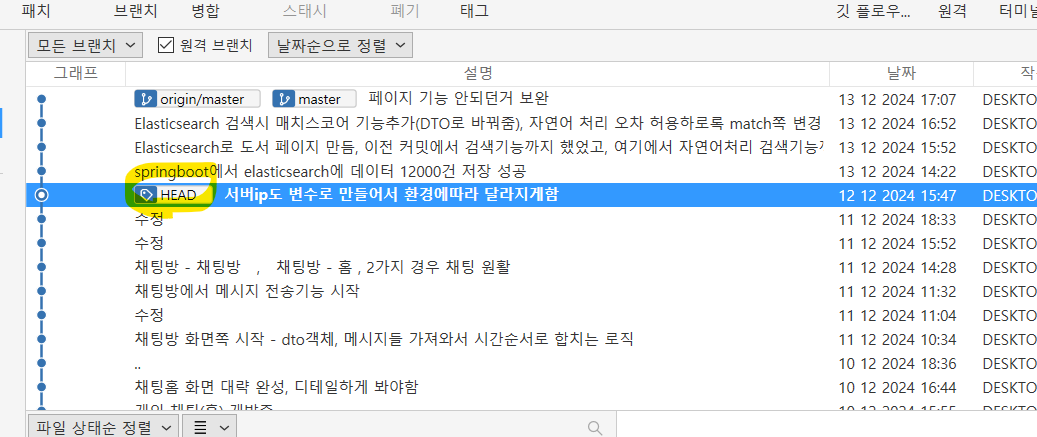 현재 브랜치로 develope을 병합 : 말 그대로 브랜치가 합쳐짐 , develope의 save point들이 현재 브랜치로 commit됨