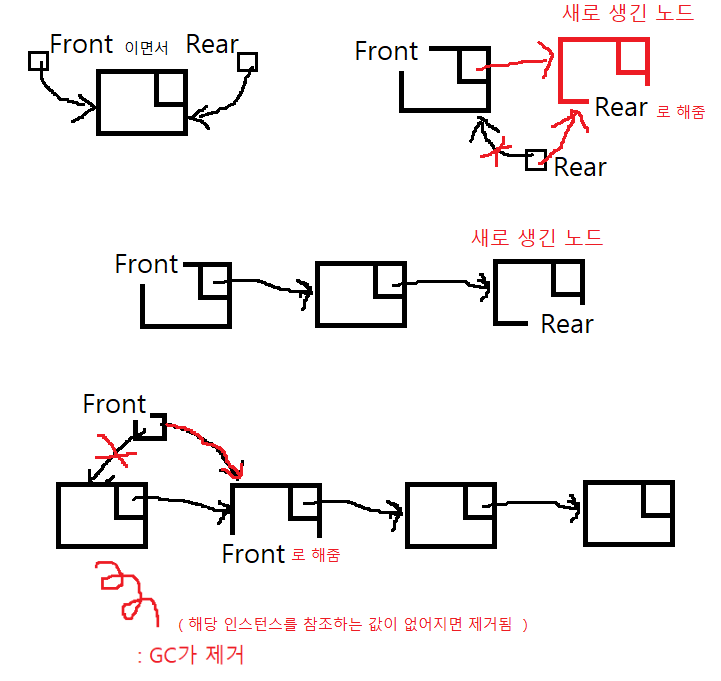 Queue의 한 쪽 끝은 프런트(front)로 정하여 삭제 연산만 수행, 다른 한 쪽 끝은 리어(rear)로 정하여 삽입 연산만 수행